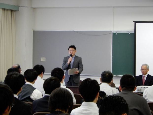 岡村先生は、素粒子論がご専門で、この講義では、大学・学部・学科の紹介、医療技術者養成教育における数学科目の内容・位置付けと履修の状況、医療と数学・物理学との関わり、入学生の読解力が低下している様子など、多岐に渡りお話をしてくださいました。
